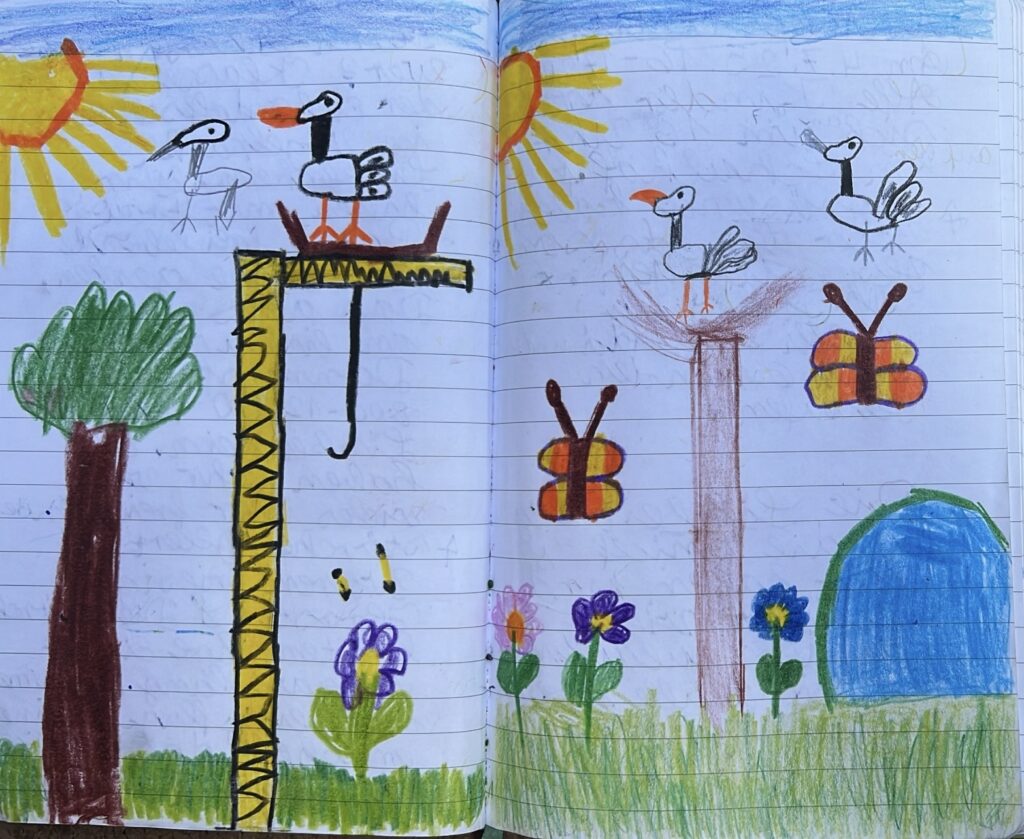 Als wir ankamen, sahen wir zwei junge Störche und zwei alte Störche. Wir beobachteten sie. Dann sahen wir einen Kran. Darauf waren vier Nester und in jedem Nest war ein Storch. Josefine, Klasse 2d